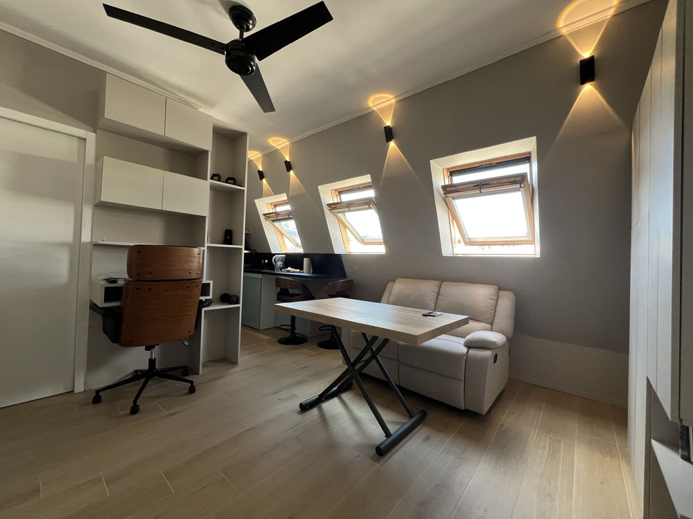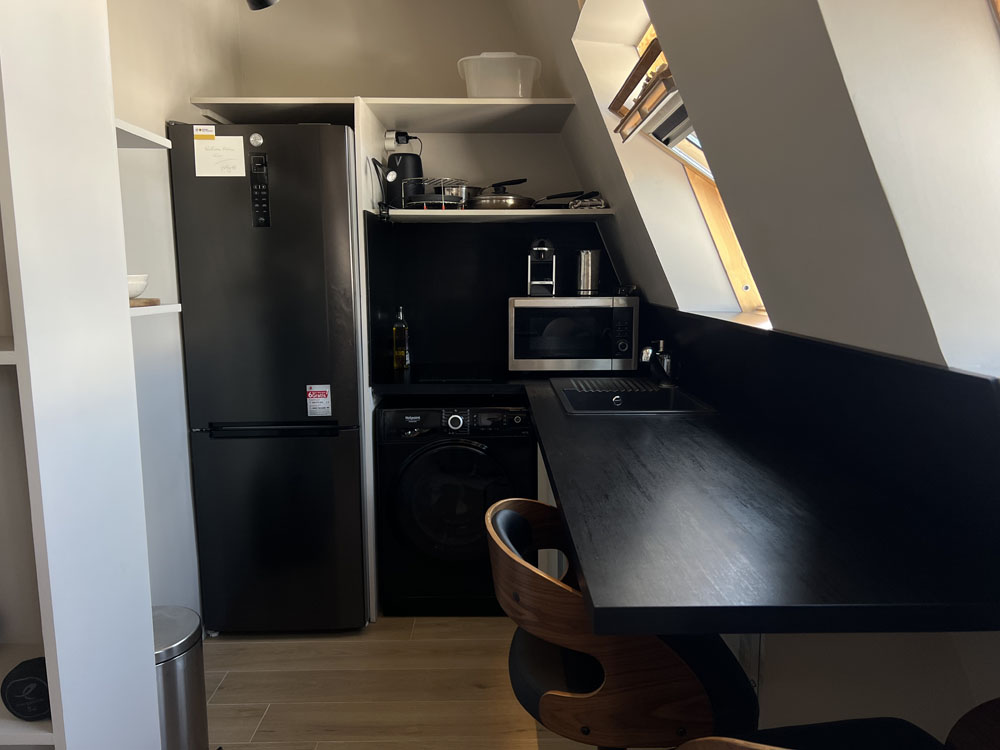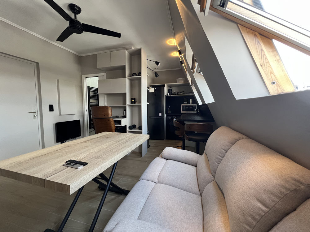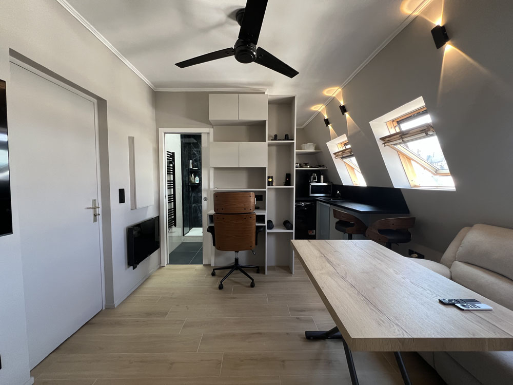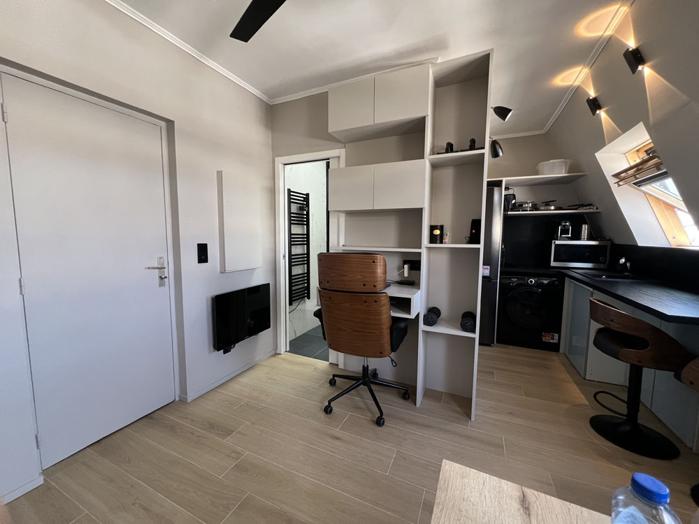 Cet élégant studio de 28m2 a été repensé pour intégrer un coin nuit cosy (lit double) ainsi qu’un confortable espace de vie équipé d’un canapé-lit. La cuisine ouverte sur le salon est propice à la convivialité. En blanc et bois, la salle de bain avec fenêtre sur cour, comprend une large douche, un wc suspendu, un lavabo miroir, une étagère moulée en plâtre et un sèche-serviette. Une armoire et une grande penderie-étagère-bureau, bordée par un miroir et éclairée au sommet par un LED, offrent d’importants rangements. Les toilettes du palier ont été transformées en bureau d’appoint. Les chauffages (anglais) les luminaires (italiens), le frigo rétro (allemand) et la qualité des électroménagers contribuent au charme de cet appartement baigné de lumière. Qui y loge: 1 à 2 personnes (peut accueillir 4 personnes) Superficie: 28m2 + 1,50m2 (bureau) Chantier: mai 2020 Durée des travaux: 3 mois Coût: 35 000 euros