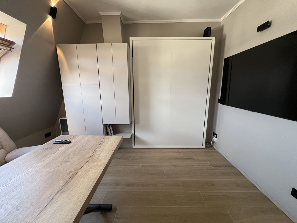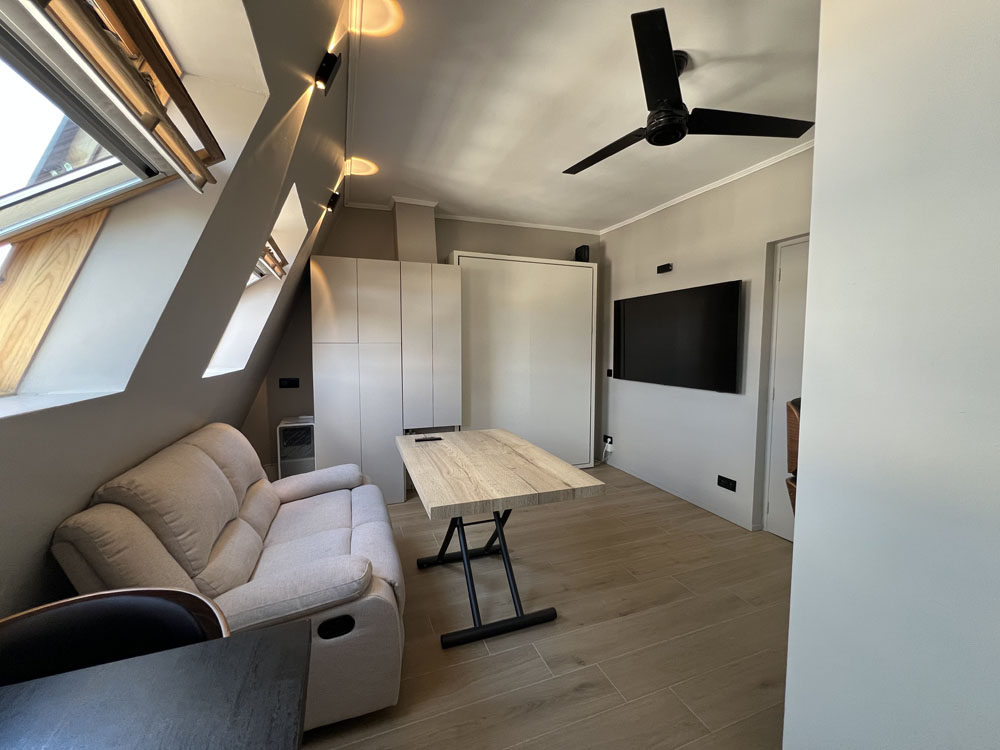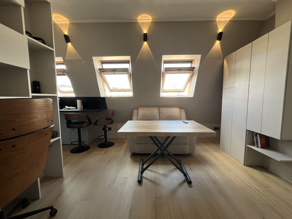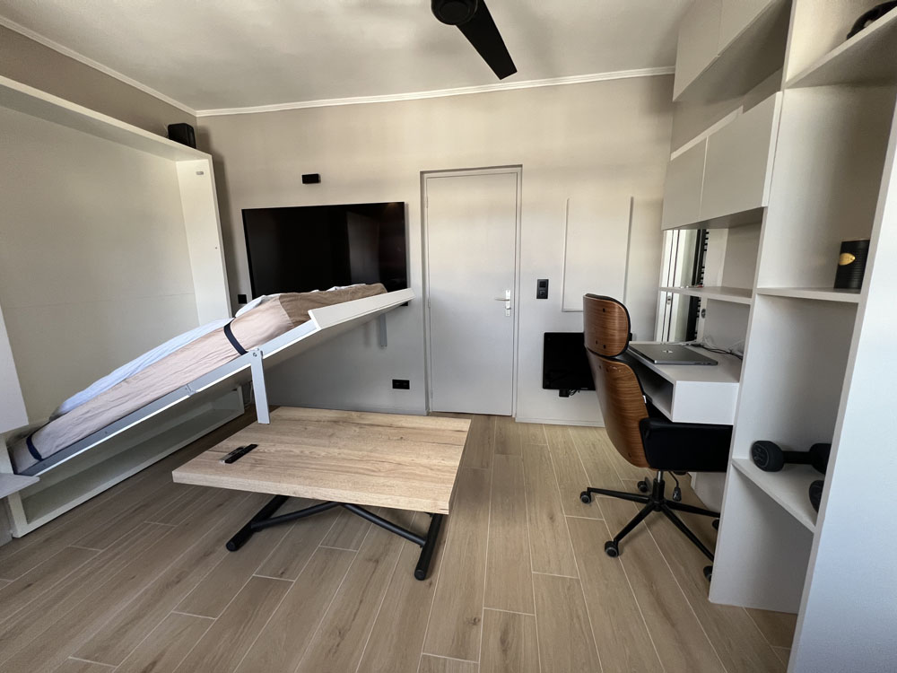 Ce local atelier en rez-de-chaussée était dépourvu de toilettes. Afin d’optimiser l’espace, nous y avons installé des sanitaires et un chauffage au sol. Les murs ont été isolés et les fenêtres changées. Un escalier en bois conçu sur mesure abrite sous chaque marche un tiroir, un coffre ou un placard. Au-dessus de l’escalier, un lit occupe la mezzanine et au dessous, un canapé-lit permet un second couchage double. Une table sur roulettes, pour dîner ou travailler, se glisse également sous l’escalier. La grande armoire abrite une machine lavante/séchante. La cuisine est entièrement équipée. Cette conception aérée a permis de faire la part belle à la lumière qui envahit le studio. Qui y loge: 1 personne (peut accueillir 3 personnes) Superficie: 15m2 Chantier: avril 2019 Durée des travaux: 3 mois Coût: 25 000 euros